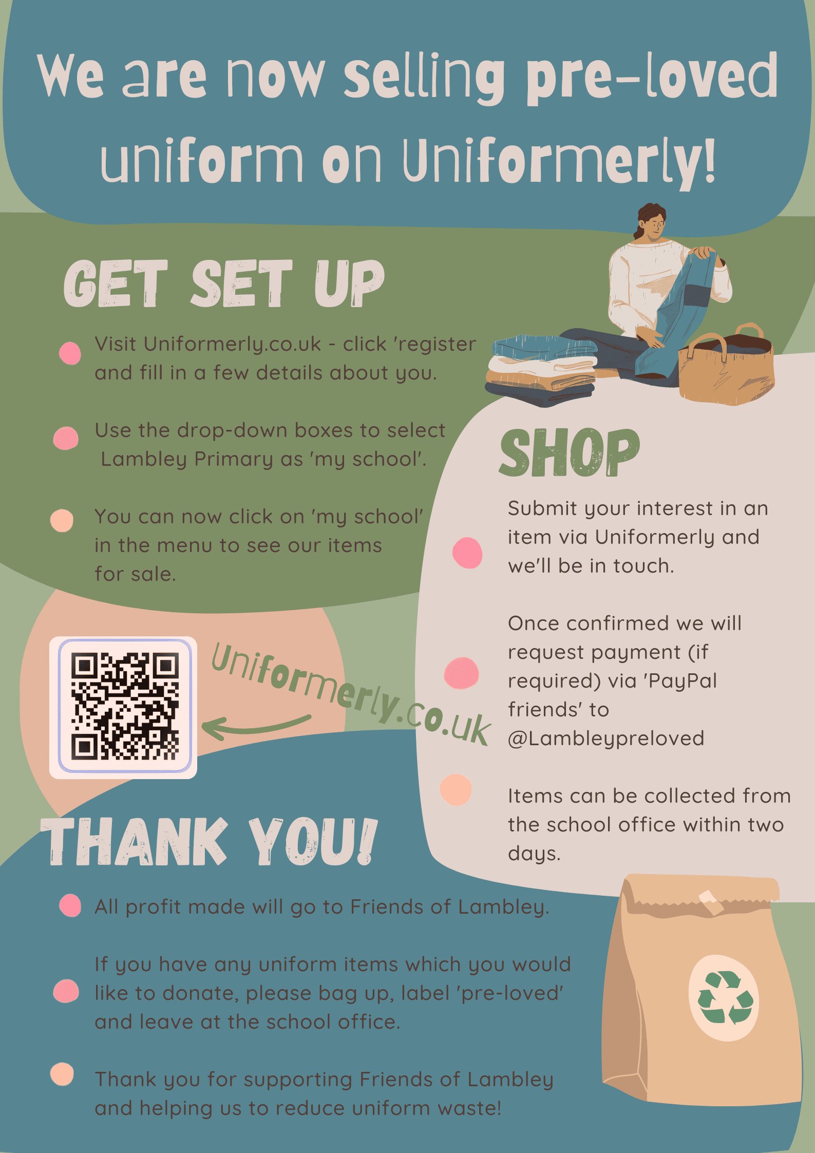As such, through working with the Friends of Lambley, we have created an online shop (Uniformerly) for donated and recycled uniform. Please see the QR code (to the right) to access the shop (scan the QR Code, register and search for Lambley in the ‘My School’ section).